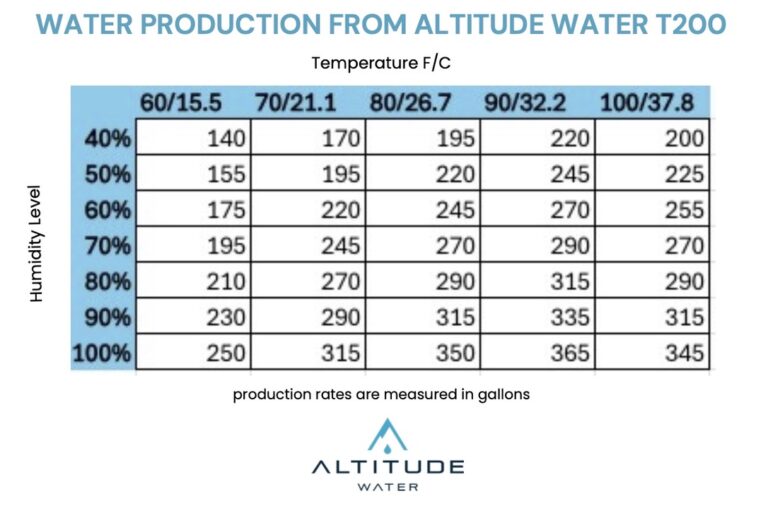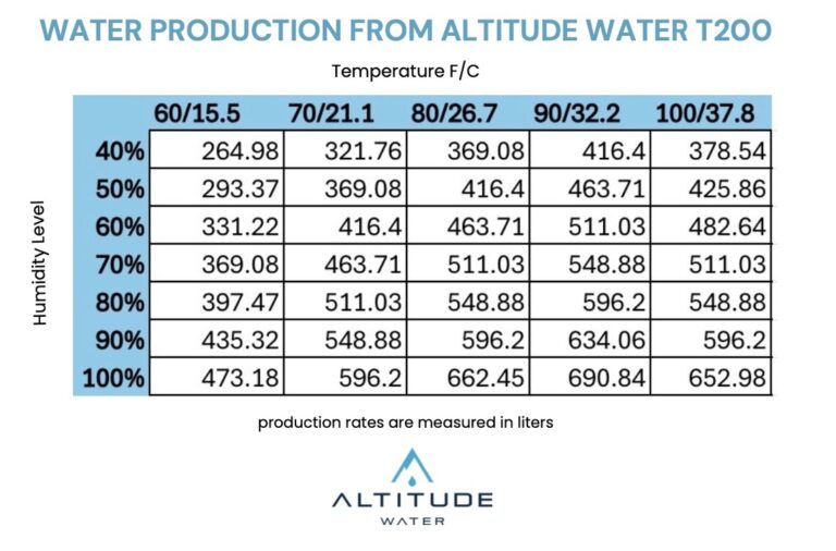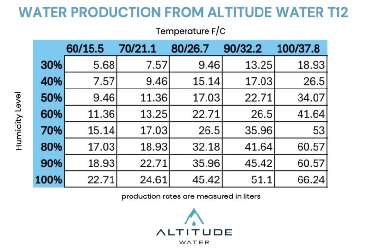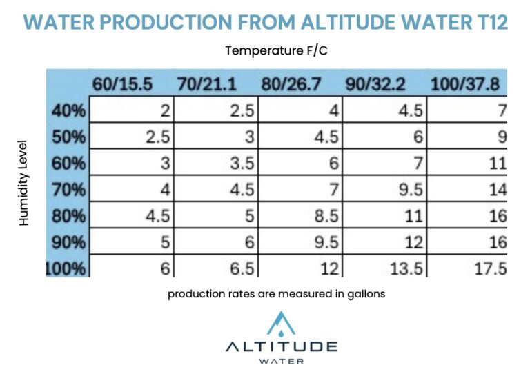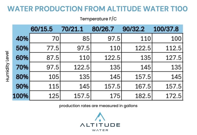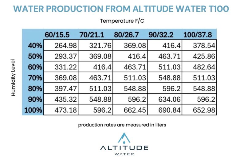 Each Altitude Water Atmospheric Water Generator (AWG) is engineered to produce a specific volume of clean drinking water per day based on temperature, humidity, and model type. Below you’ll find the daily water-production capacity for each unit when operating under standard environmental conditions (80°F / 60% humidity):